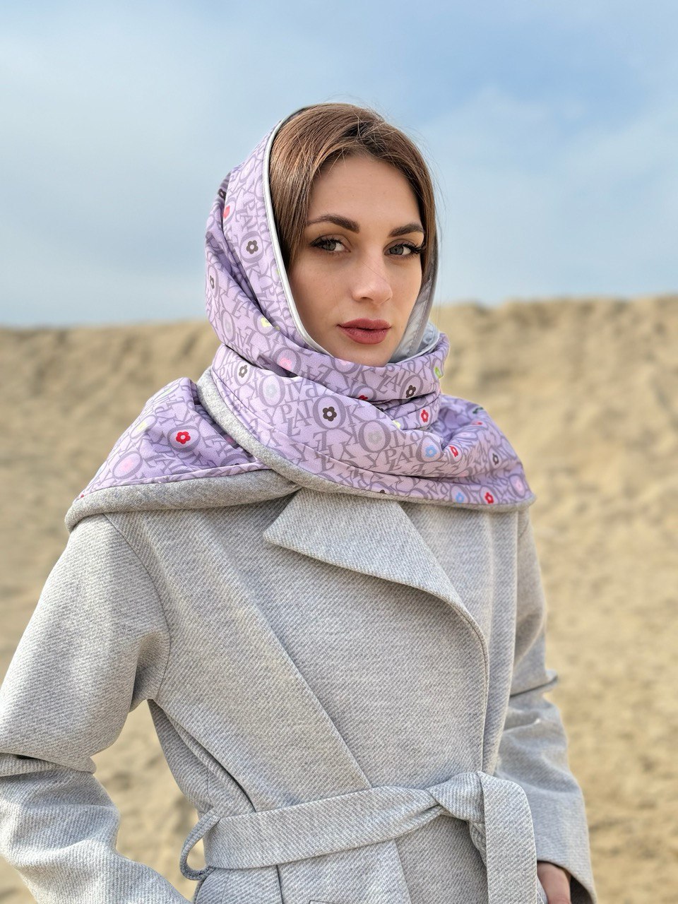 Каждый платок-трансформер выполнен из утеплённого, мягкого и приятного на ощупь материала, который держит форму, не мнётся и защищает от ветра. Его треугольная форма создана так, чтобы платок можно было легко драпировать и фиксировать на кнопке — без булавок и сложных приёмов.