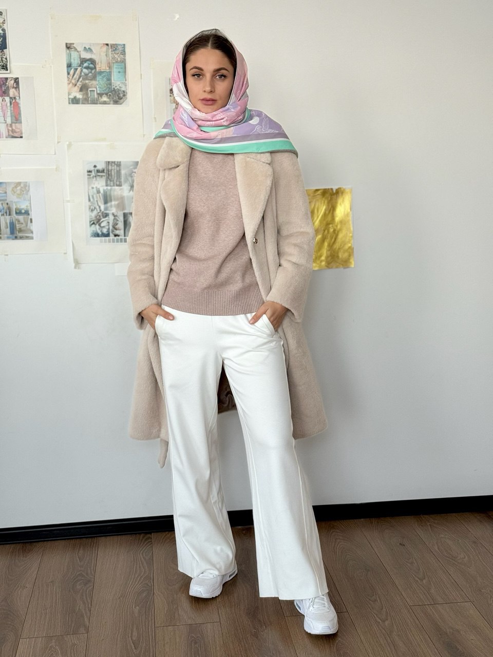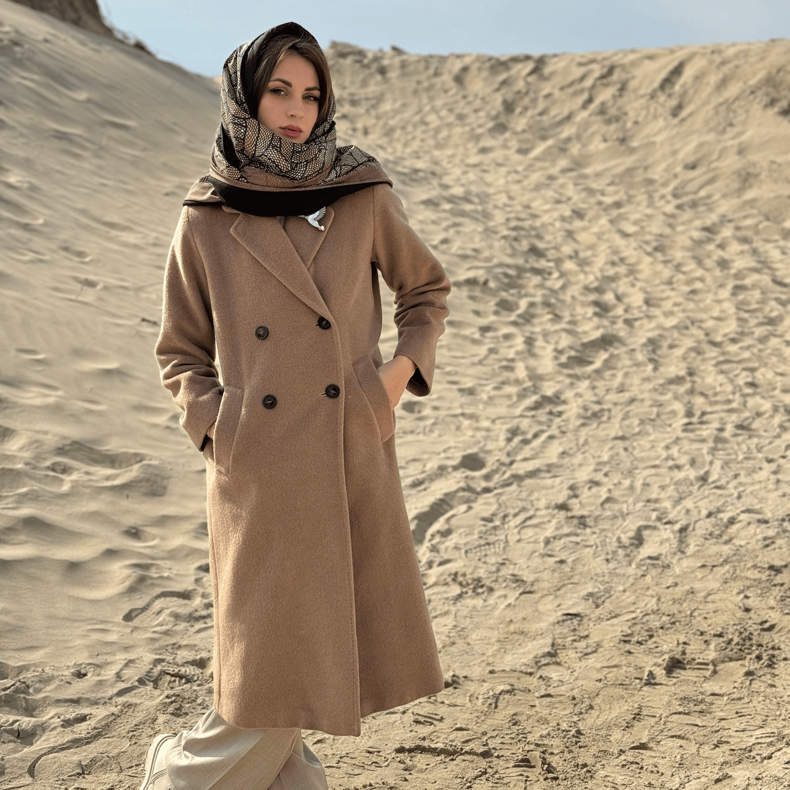 - Бежевое пальто просит тепла и текстуры. Попробуйте платок под бежевое пальто в карамельных или терракотовых тонах.